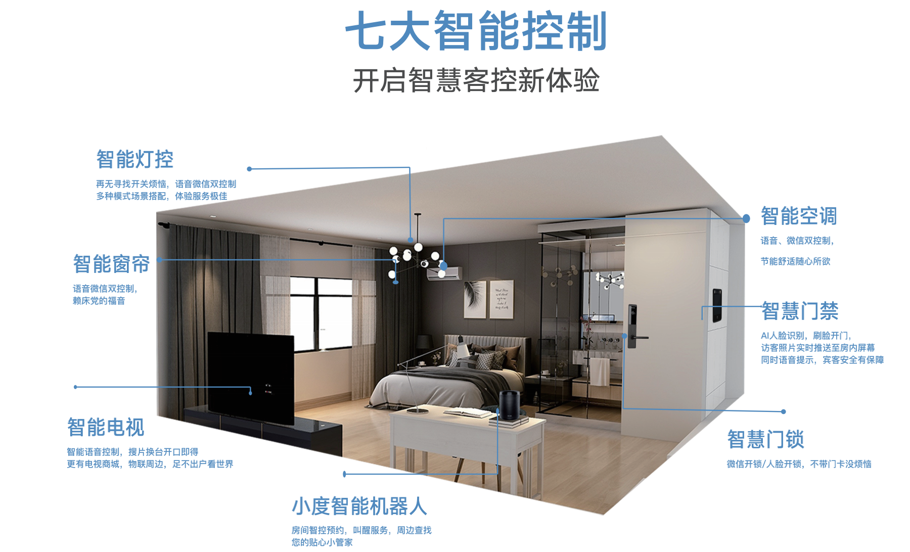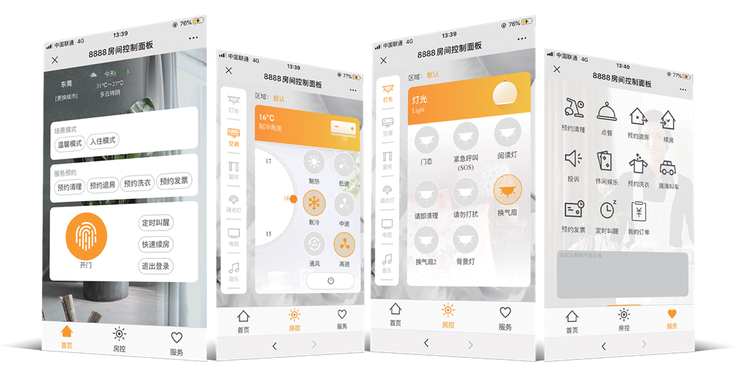 1、賓客可(kě)通(tōng)過微(wēi)信實現(xiàn)選房(fáng)、訂房(fáng)、開₽(kāi)鎖、控制(zhì)客房(fáng)設備、點餐、呼叫服務、續房(fáng)和(hé)退房(fáng)等功★能(néng)。